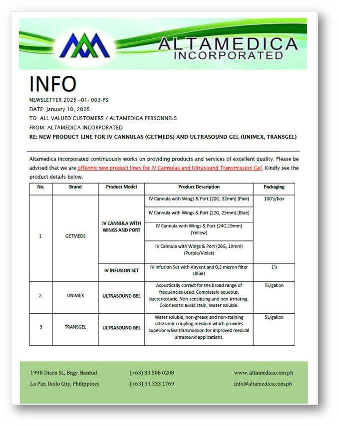 Altamedica Incorporated is excited to announce the addition of a new product line, featuring IV Cannulas and Ultrasound Transmission Gel. As part of our commitment to continuously providing medical products and services of the highest quality, we are proud to offer these new items.